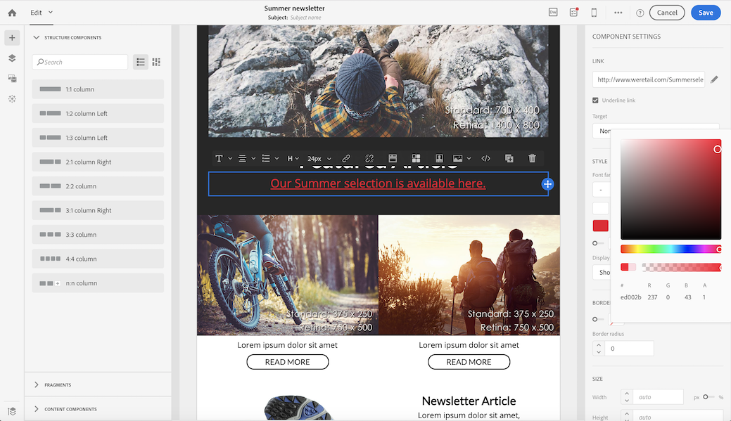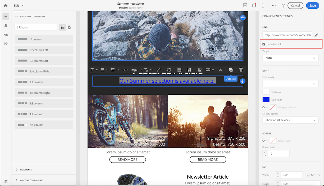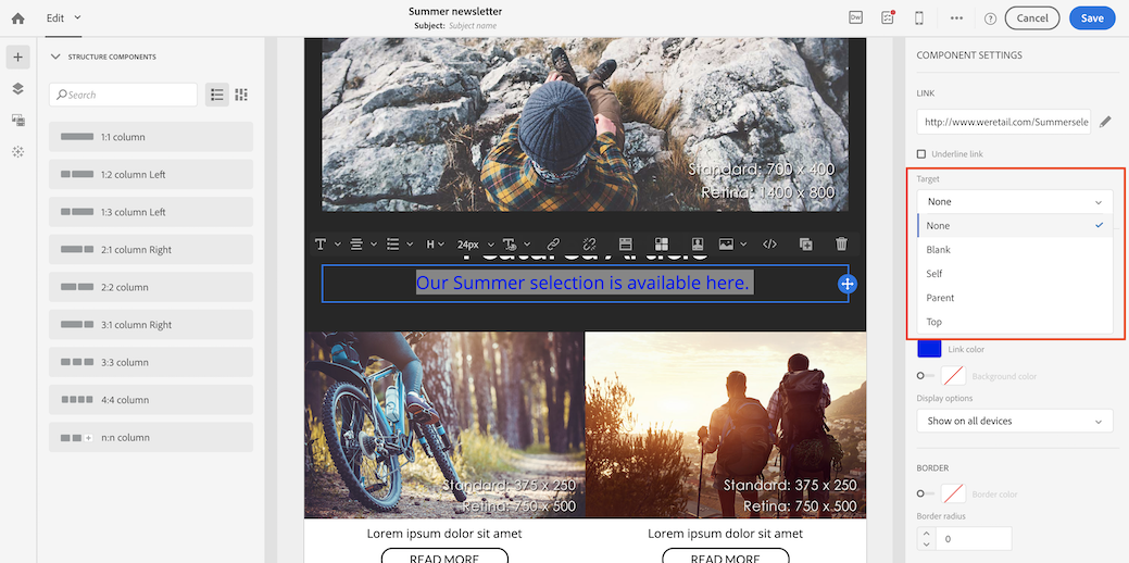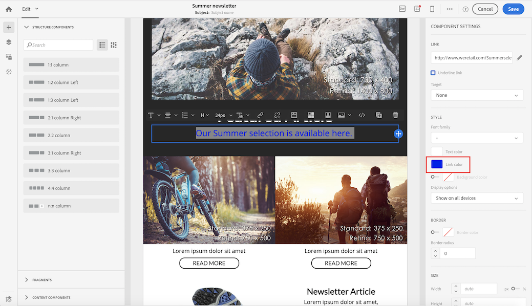 링크에 밑줄을 긋고 이메일 디자이너에서 해당 색상과 타겟을 선택할 수 있습니다.