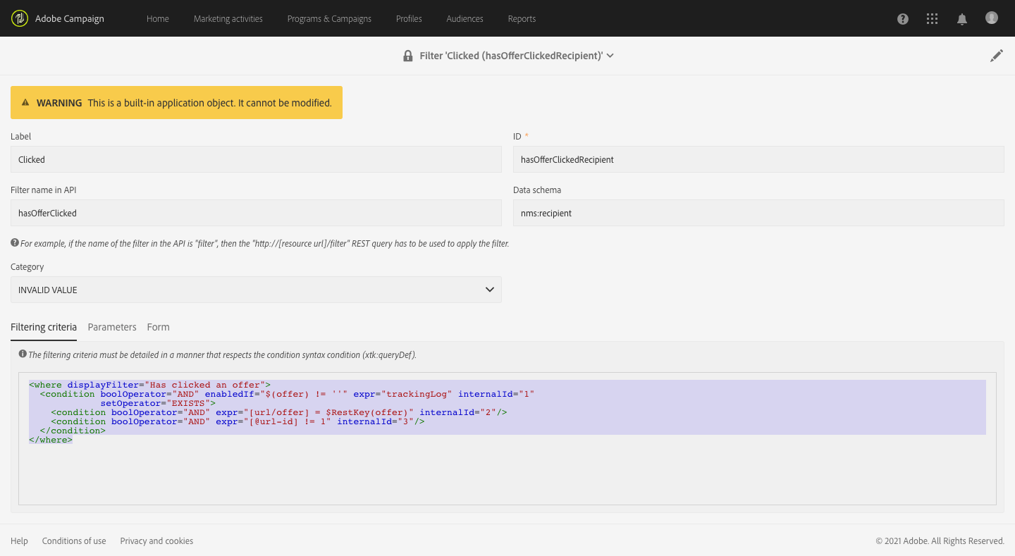 <where displayFilter="Has clicked an offer">