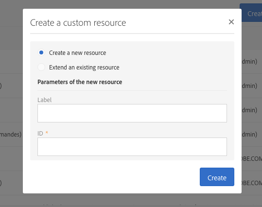Administration > Development > Custom Resources에서 Create 단추를 클릭합니다.