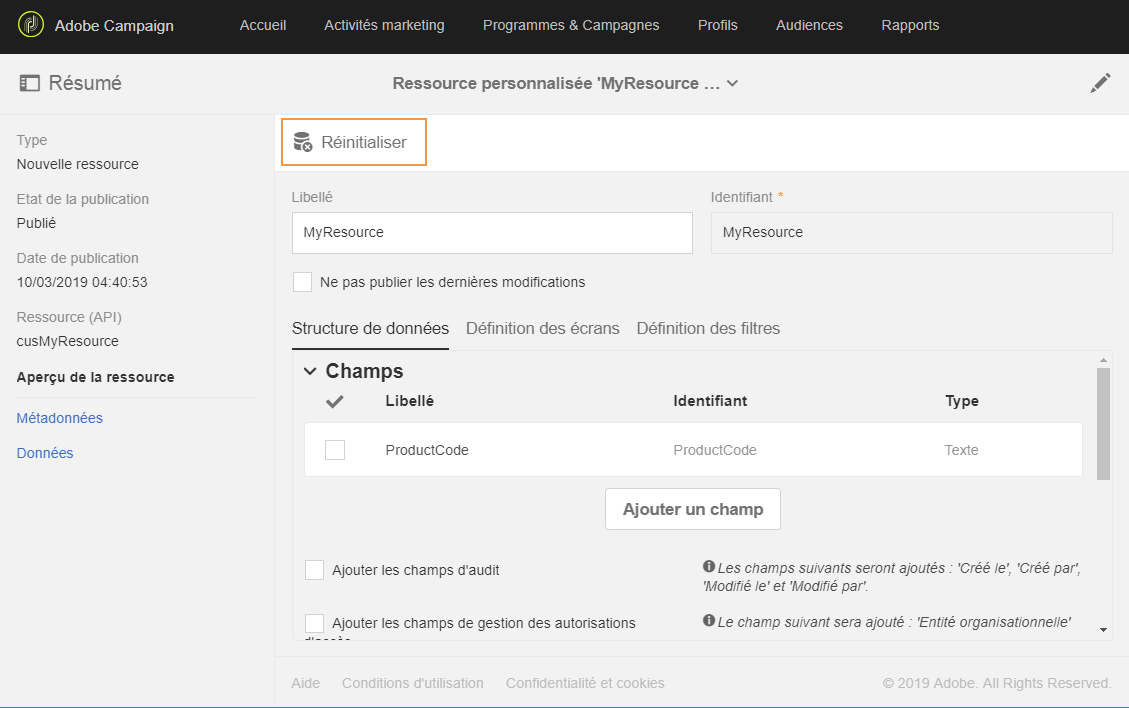 La réinitialisation et la suppression d'une ressource personnalisée sont des opérations sensibles pouvant avoir un impact sur d'autres ressources. Ces actions doivent être effectuées par un utilisateur expert uniquement.