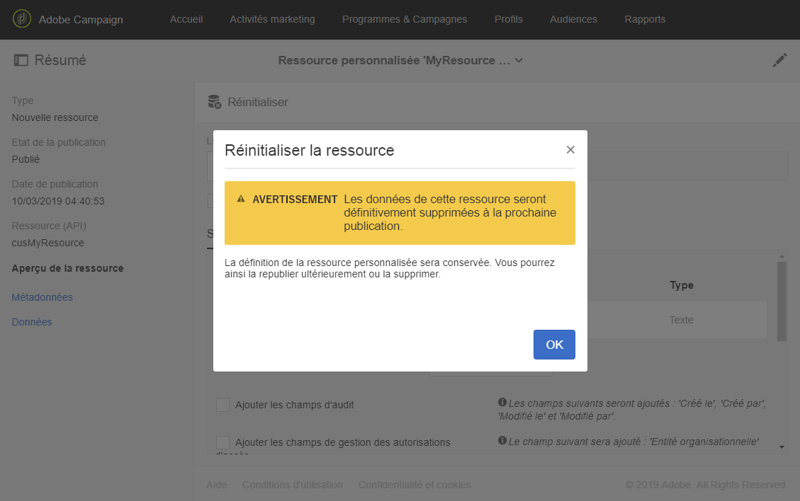 Si le champ d'une ressource personnalisée utilisée lors d'un événement est modifié ou supprimé, l'événement correspondant sera automatiquement dépublié. Voir Dépublier un message transactionnel.