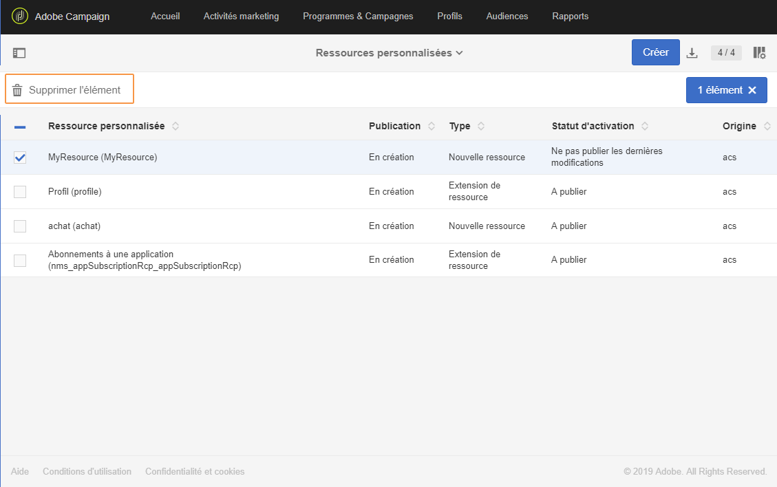 Pour supprimer une ressource, celle-ci doit être En création. La ressource est En création si :