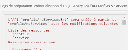 - Lors de l'extension des ressources personnalisées Profils ou Services, vous pouvez effectuer une mise à jour de l'API Profiles et Services afin d'intégrer les champs déclarés dans l'extension des ressources personnalisées.