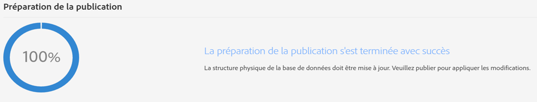 Cliquez sur le bouton Préparer la publication pour lancer l'analyse. Veuillez noter que les mises à jour importantes des tables devraient être réalisées lorsque l'instance ne fait pas l'objet d'une utilisation intense par les workflows.
