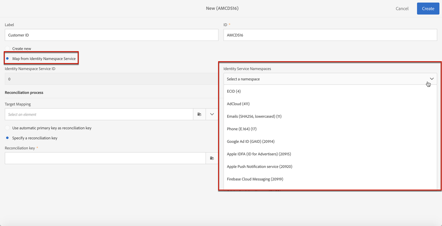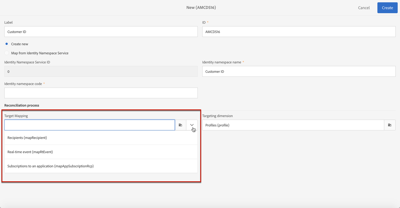 Identity Service에서 새 네임스페이스를 만들어 Campaign에 매핑하려면 Create new을(를) 선택하고 Identity namespace name 필드에 이름을 입력합니다.