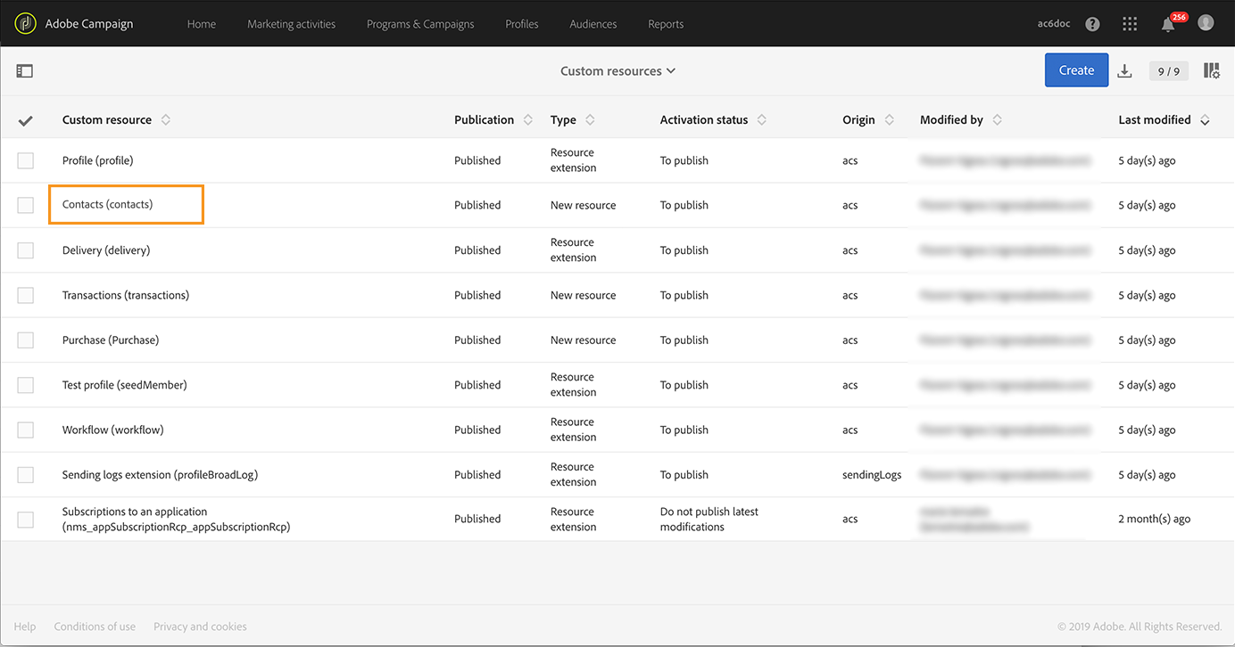 Clique no logotipo do Adobe Campaign no canto superior esquerdo e selecione Administration > Development > Custom resources.