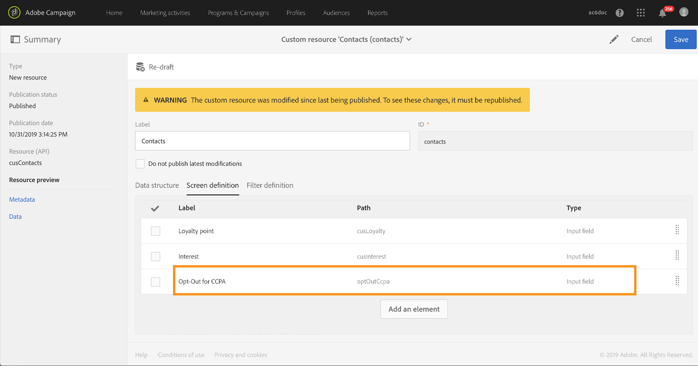 Se você usar um recurso de perfil personalizado, precisará estender o recurso e adicionar o campo. Recomendamos que você use um nome diferente do campo predefinido, por exemplo: Opt-Out for CCPA (optoutccpa). Quando um campo é criado, ele se torna automaticamente compatível com a API do Campaign.