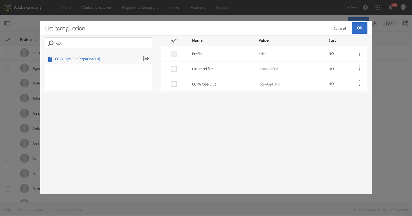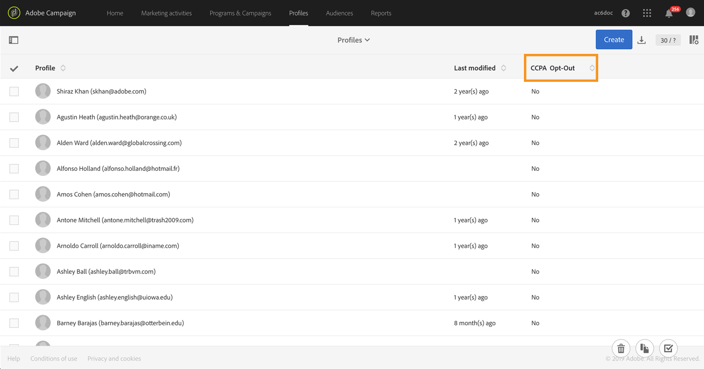 O campo CCPA Opt-Out já está pronto para ser utilizado na interface e API do Campaign. Por padrão, o campo está disponível para o recurso Profile.