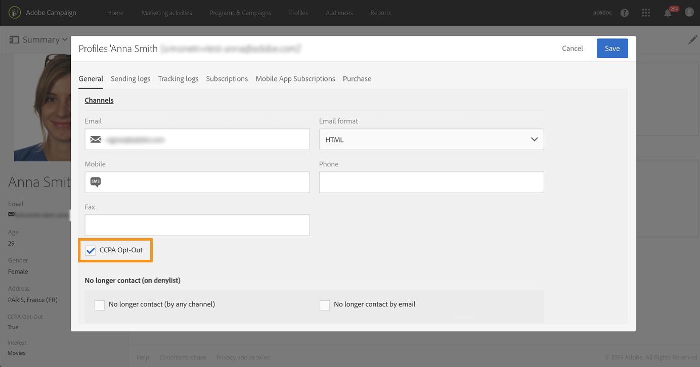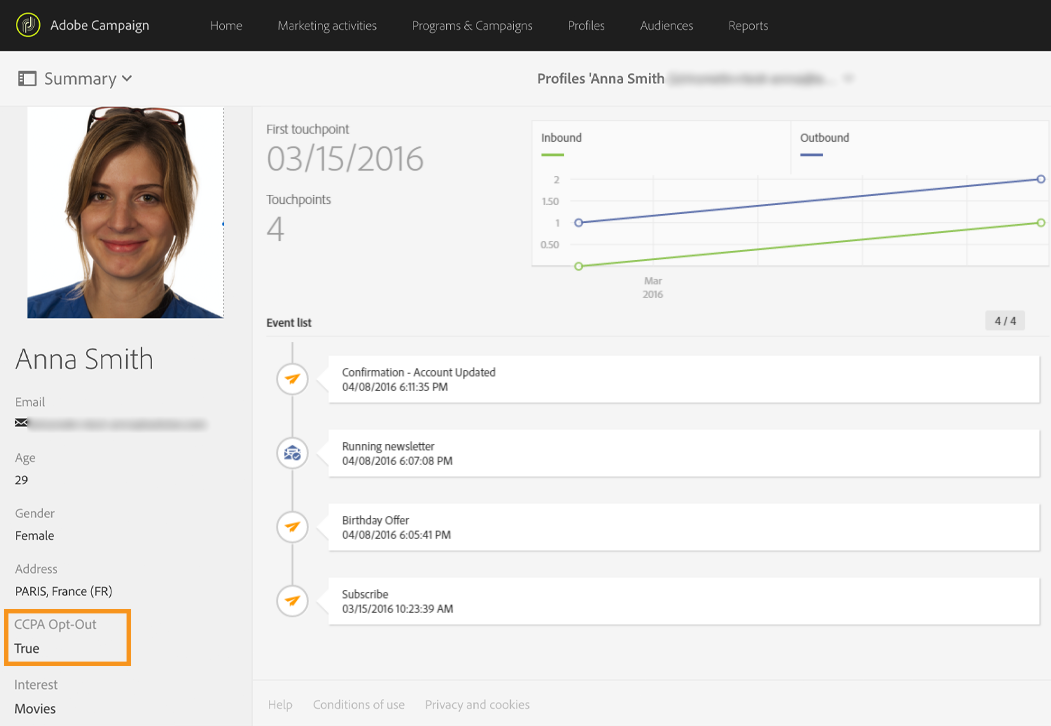 Além das ferramentas de Gerenciamento de consentimento oferecidas pelo Adobe Campaign, existe a possibilidade de monitorar se o cliente optou pela não participação na venda de Informações pessoais.