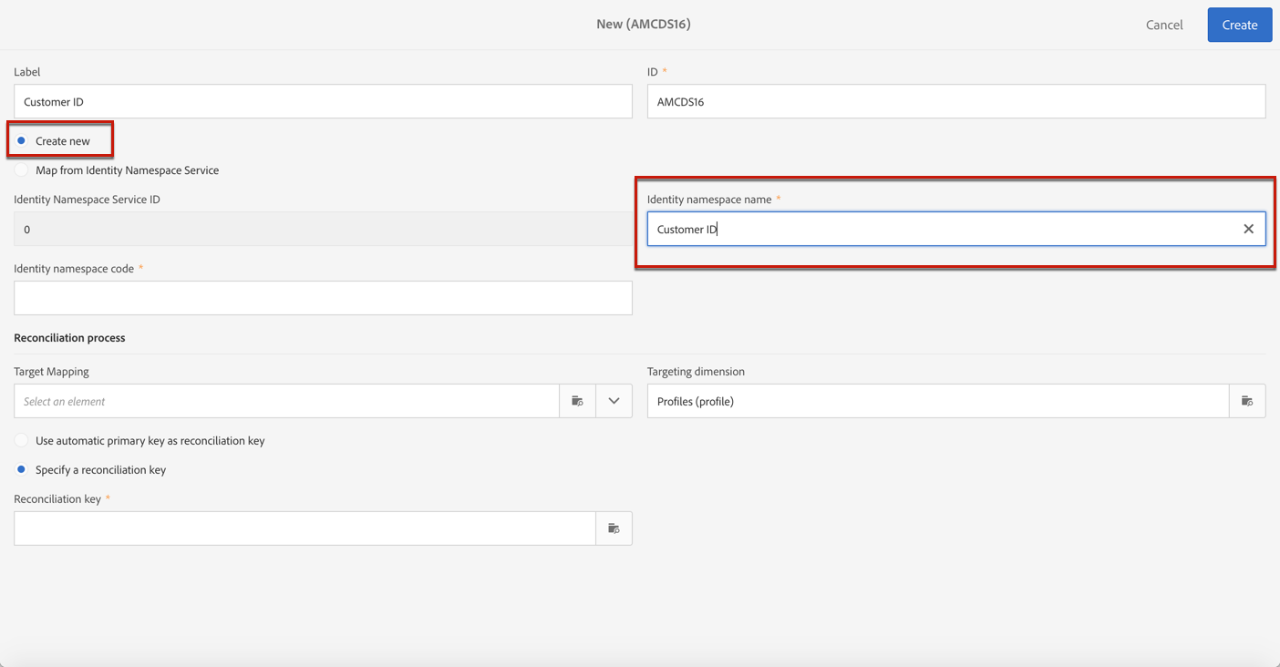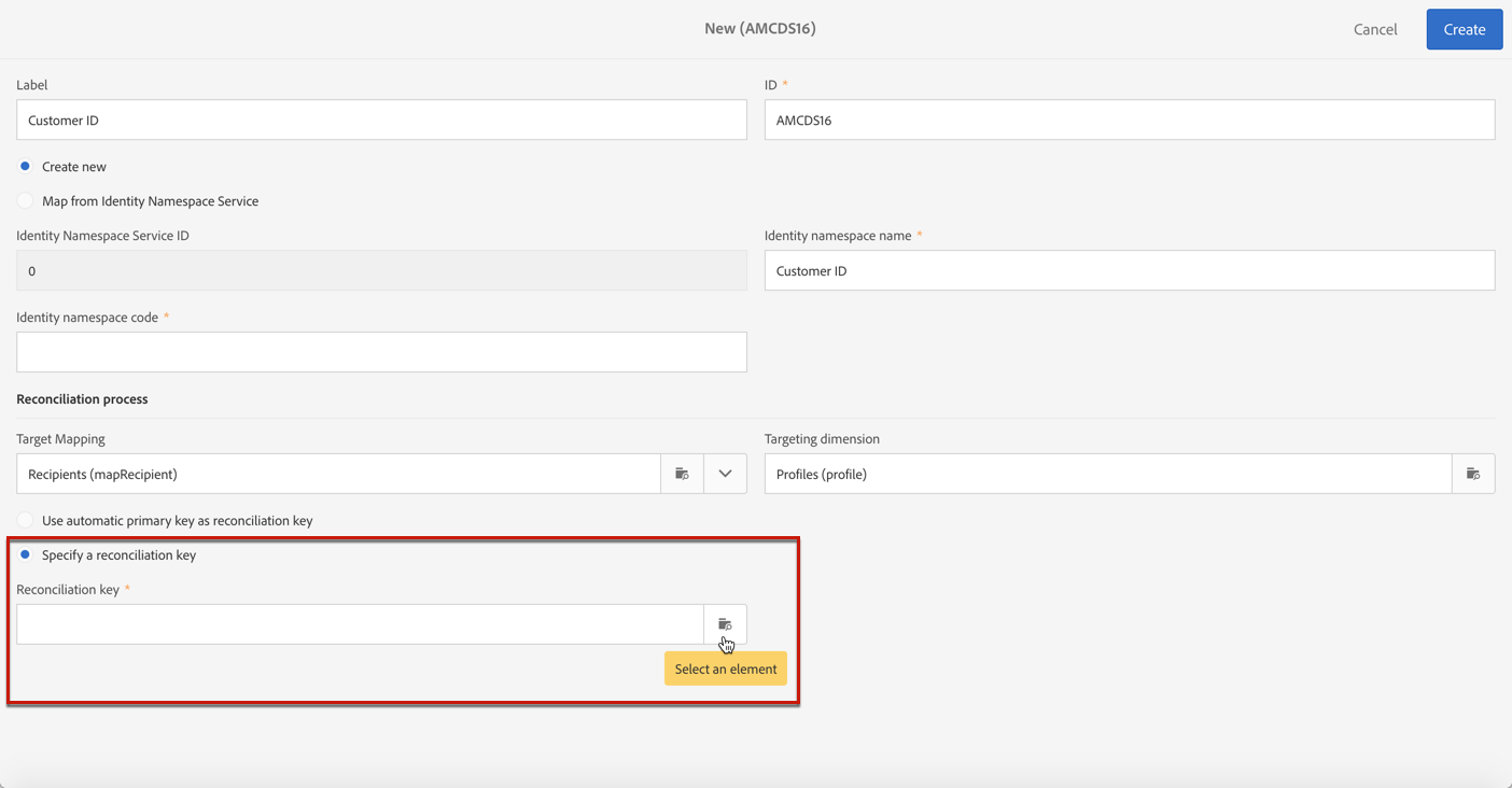 Se quiser criar um novo namespace em Identity Service e mapeá-lo no Campaign, selecione Create new e insira um nome no campo Identity namespace name.