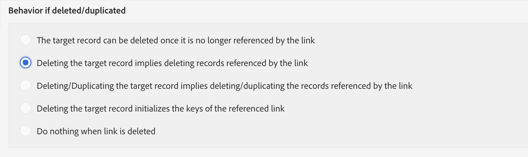 Na seção Behavior if deleted/duplicated selecione a opção Deleting the target record implies deleting records referenced by the link.