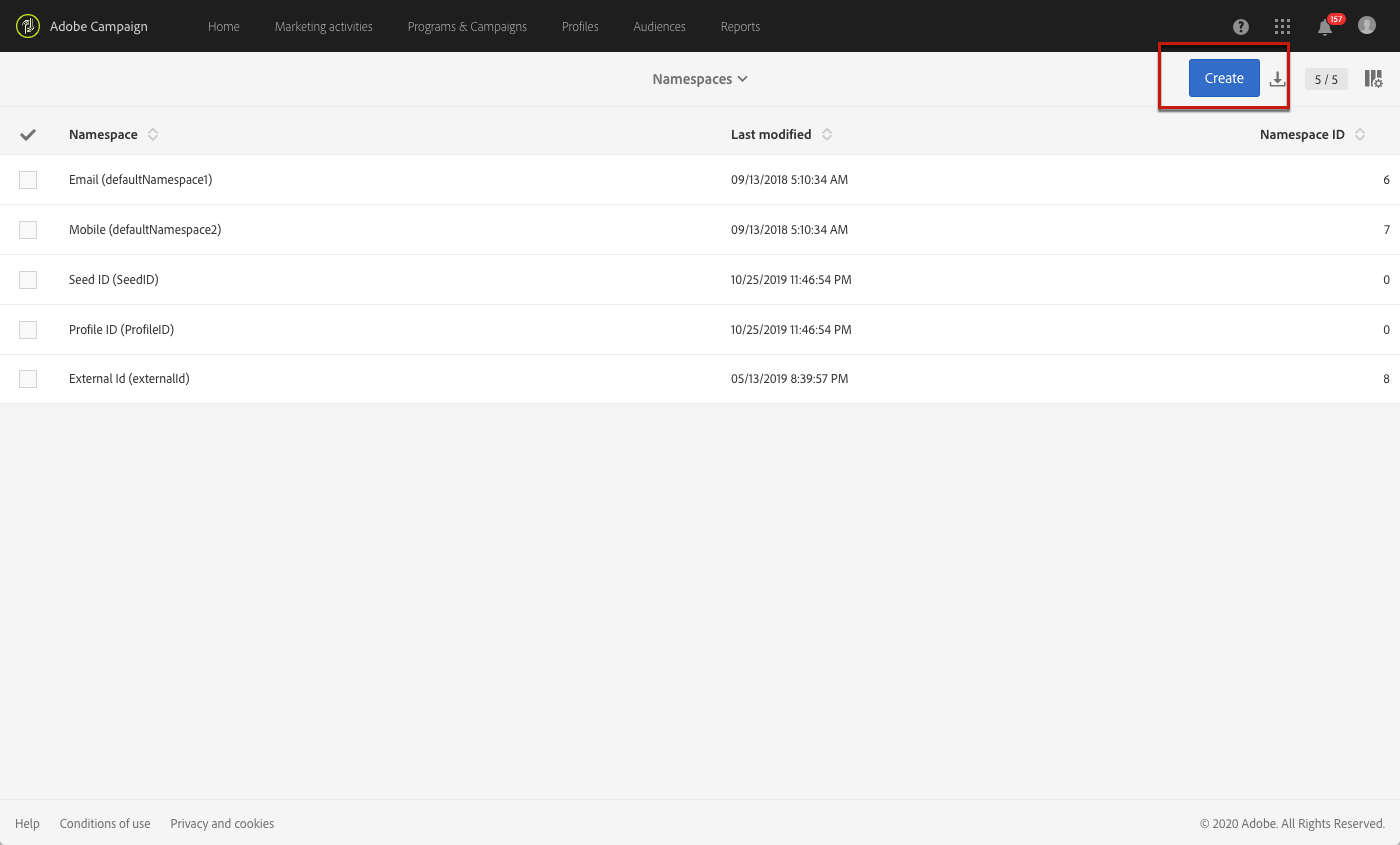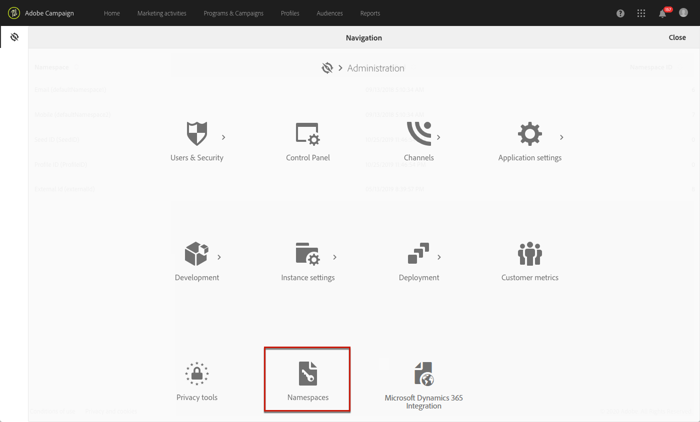 Clique no logotipo do Adobe Campaign no canto superior esquerdo e selecione Administration > Namespaces.