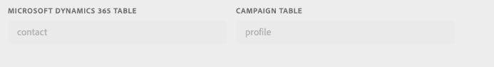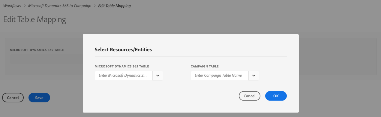 Utilisez les listes déroulantes pour sélectionner les tables Microsoft Dynamics 365 et Campaign à mapper.