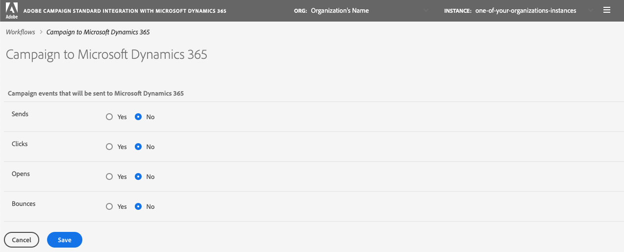 La page Campaign vers Microsoft Dynamics 365 vous permet d'identifier les événements de marketing par email qui seront mappés d’Adobe Campaign vers Microsoft Dynamics 365.