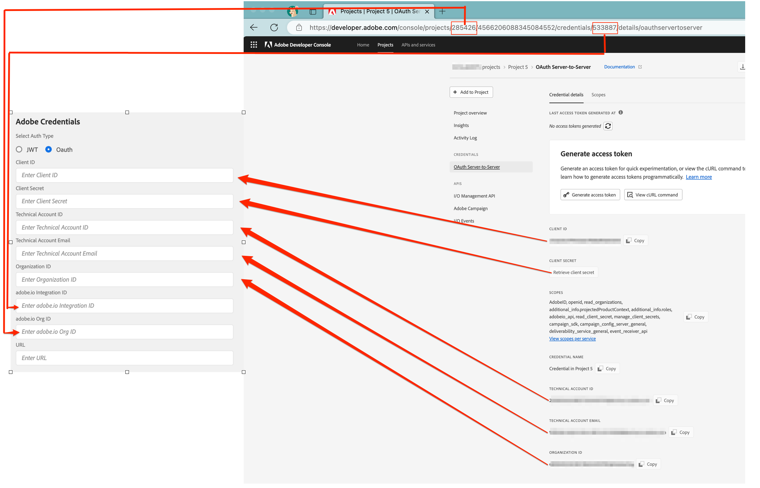 다음 이미지는 Adobe I/O과 설정 화면 입력 간의 매핑에 대해 자세히 설명합니다.
