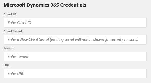 Microsoft Dynamics 365 자격 증명을 사용하면 통합 응용 프로그램에 Microsoft Dynamics 365에서 데이터를 가져올 수 있는 권한을 부여합니다. 먼저 화면의 단계를 따라야 합니다 Campaign 통합을 위해 Microsoft Dynamics 365 구성 를 입력하여 이 화면에 붙여넣을 값을 생성합니다. 아래 설명된 입력은 이 화면을 참조합니다.