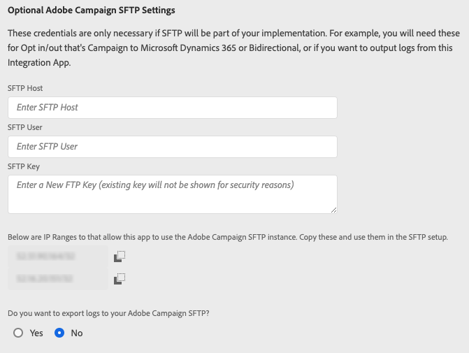 다음 Adobe Campaign SFTP로 로그를 내보내시겠습니까? 통합에서 SFTP 종단점에 로깅 정보를 출력할지 여부를 결정할 수 있습니다. Adobe Campaign 또는 Microsoft Dynamics 365에서 예상한 정보가 표시되지 않는 경우 디버깅에 도움이 될 수 있습니다.