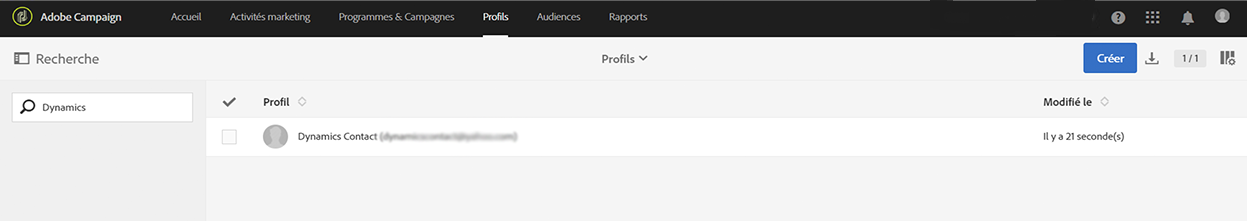 Lorsqu'un contact est créé, modifié, ou supprimé (si la suppression est activée) dans Microsoft Dynamics 365, il est envoyé à Campaign Standard. Ces contacts seront visibles dans l’écran Profils de Campaign et peuvent être ciblés dans les campagnes marketing. Voir l’écran Profils ci-dessous.