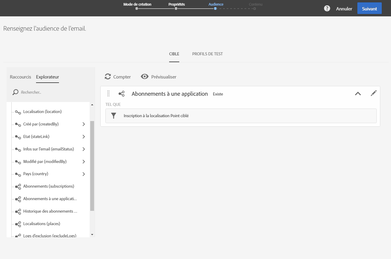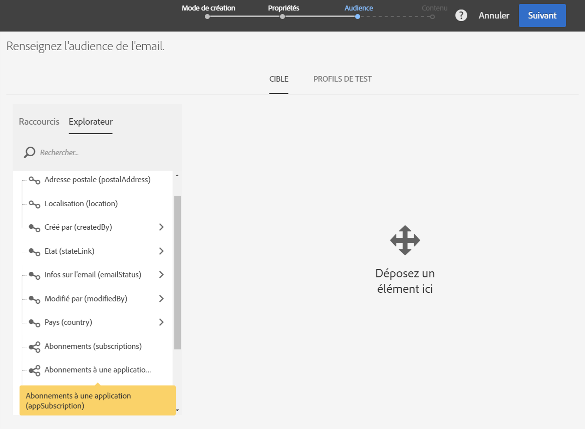 Lors de la définition de l’audience de la diffusion, placez l’élément Abonnements à une application dans l’espace de travail.
