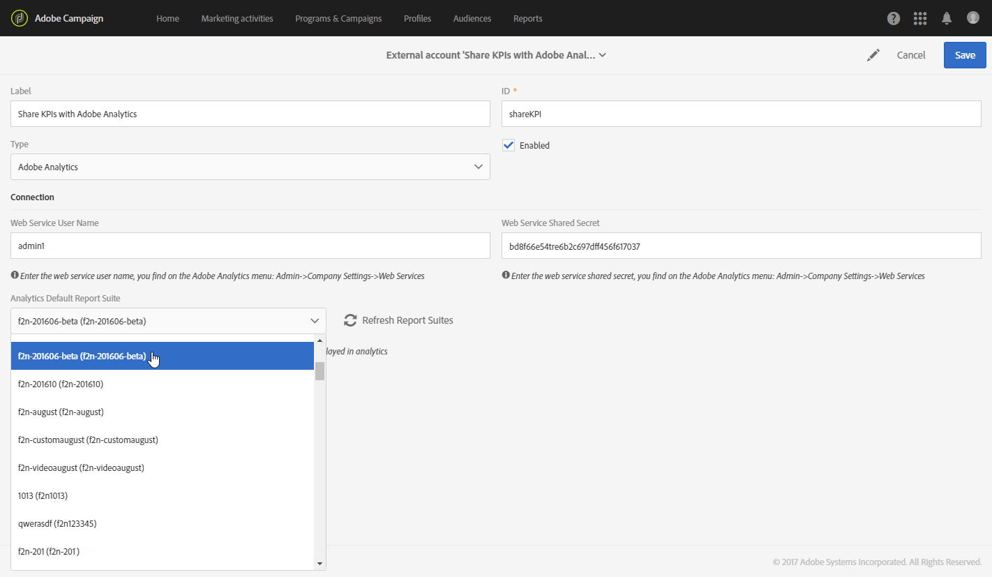 에서 을(를) 선택합니다. Analytics default report suite Adobe Campaign 데이터로 보강할 Adobe Analytics 보고서 세트를 드롭다운합니다.