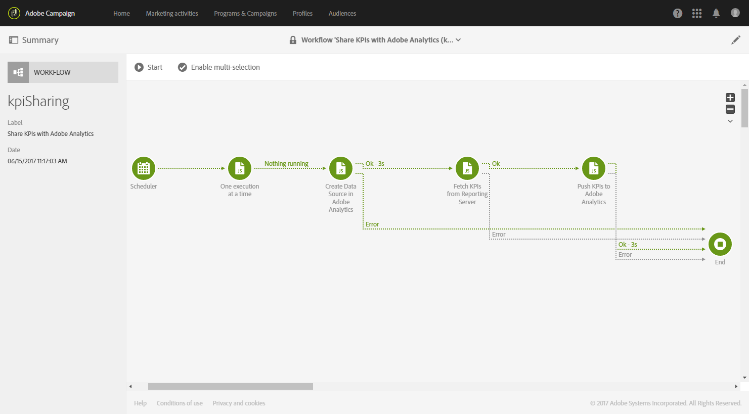 다음 Share KPIs with Adobe Analytics 기술 워크플로우는 이제 자동으로 실행되고 고급 메뉴에서 을 선택하여 볼 수 있습니다 Administration > Application settings > Workflow. 이 기술 워크플로우는 최대 6개월 된 브로드로그를 유지할 수 있습니다. 이 워크플로우는 증분 이며 이전 날짜의 데이터를 푸시합니다.