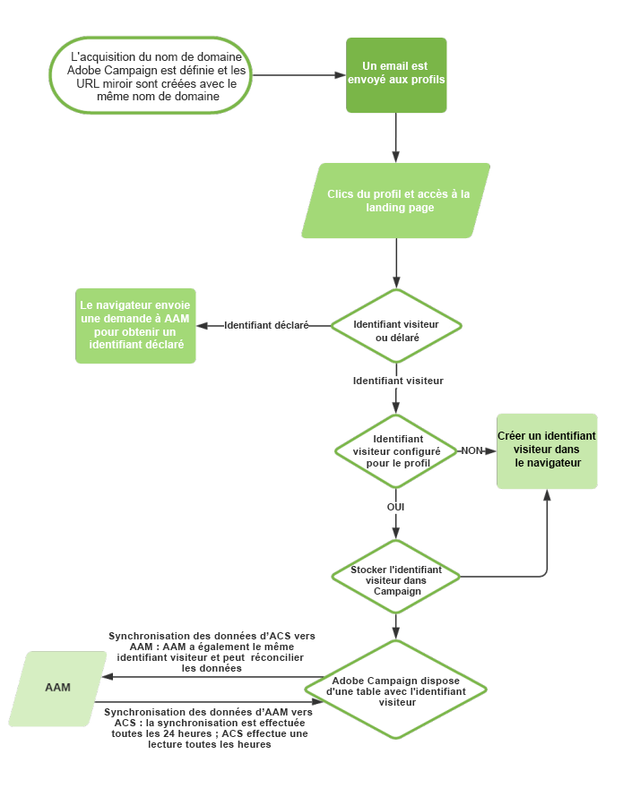 Le diagramme suivant décrit le fonctionnement de cette intégration. Ici, AAM signifie Adobe Audience Manager, et ACS Adobe Campaign Standard.