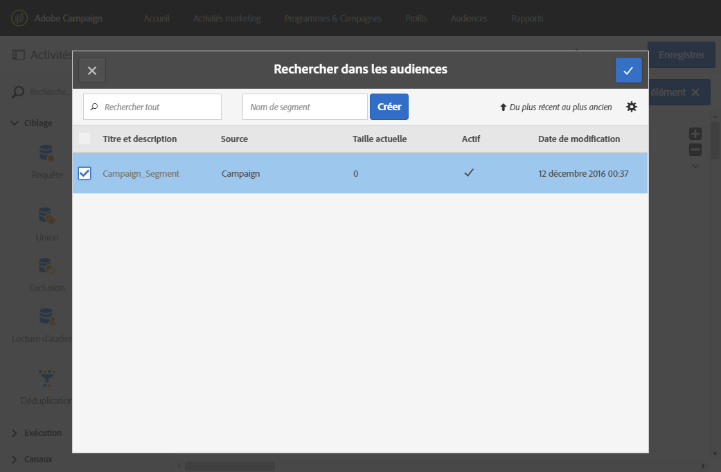 Votre audience est maintenant importée dans votre base de données Adobe Campaign. Le processus d'import prend entre 24 et 36 heures pour se synchroniser lorsque les segments sont importés directement à partir de People core service ou d'Audience Manager. Au terme de cette période, vous pourrez trouver et utiliser votre nouvelle audience dans Adobe Campaign.