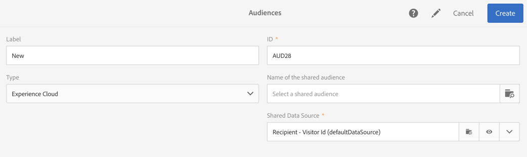 에서 Name of the shared audience 필드에서 가져올 대상자를 선택합니다. 세그먼트만 가져올 수 있습니다. 키-값 쌍, 트레이트 및 규칙을 포함한 세부적인 데이터는 지원되지 않습니다.