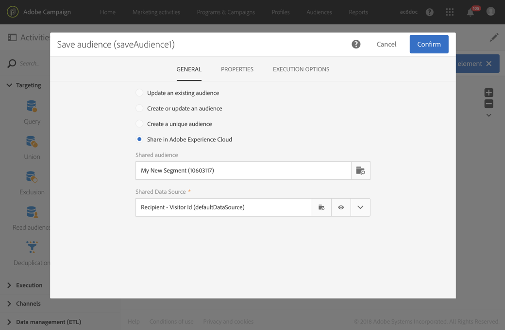 워크플로우 및 를 사용하여 Adobe Campaign에서 Audience Manager 또는 People 핵심 서비스로 대상자를 내보낼 수 있습니다 Save audience 활동.