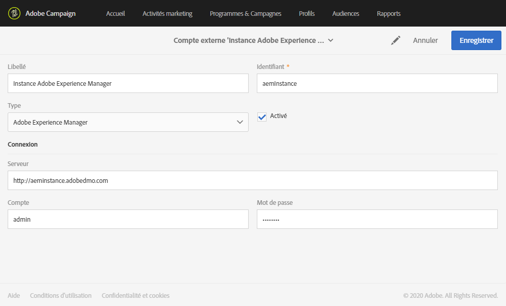 Configurez le compte externe de type Adobe Experience Manager avec l’URL de votre serveur , le compte et le mot de passe.