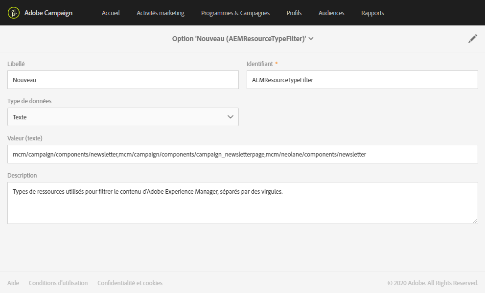 Ensuite, connectez Adobe Experience Manager à Adobe Campaign en configurant un Cloud Service dédié. Consultez cette section.