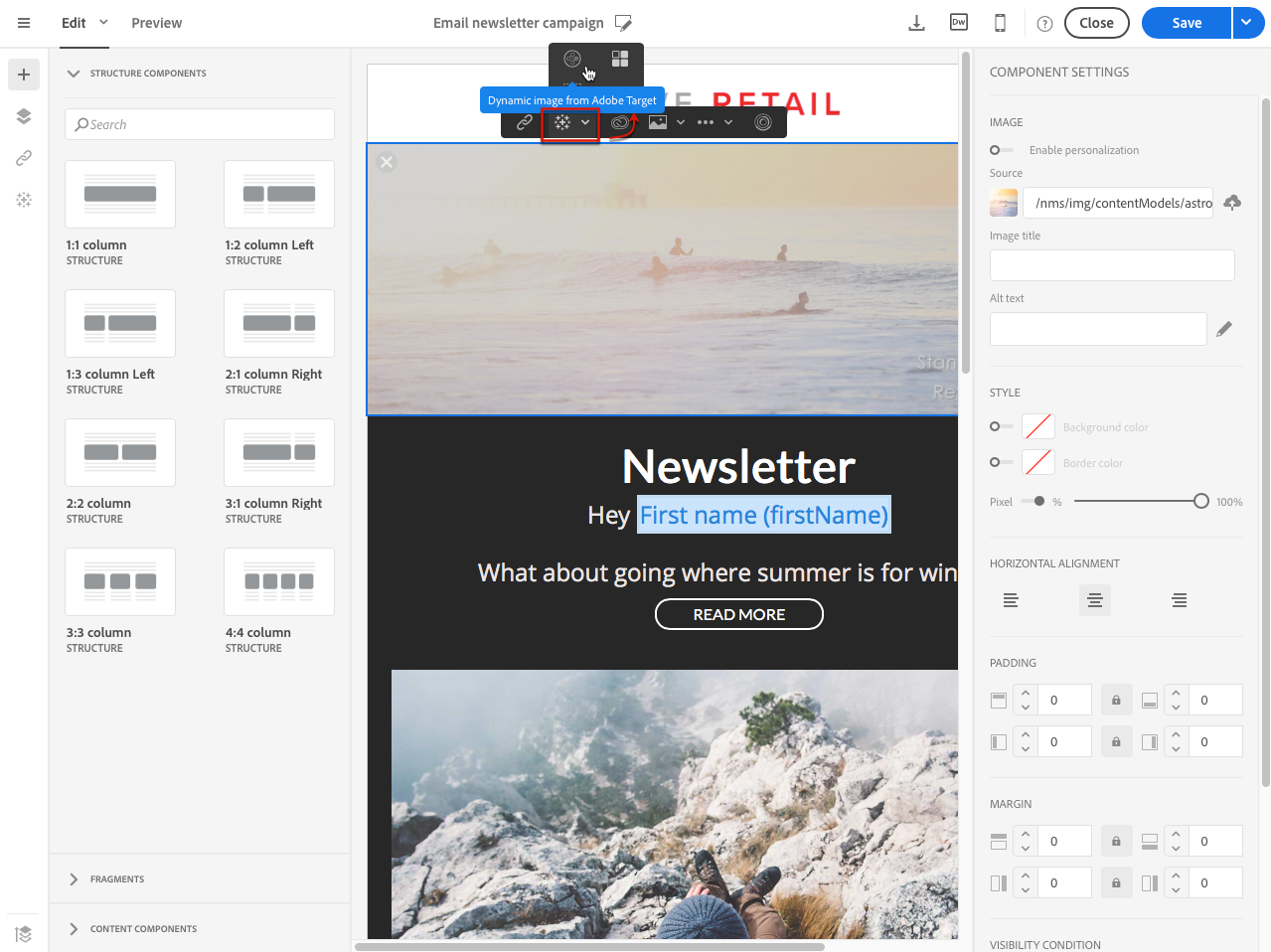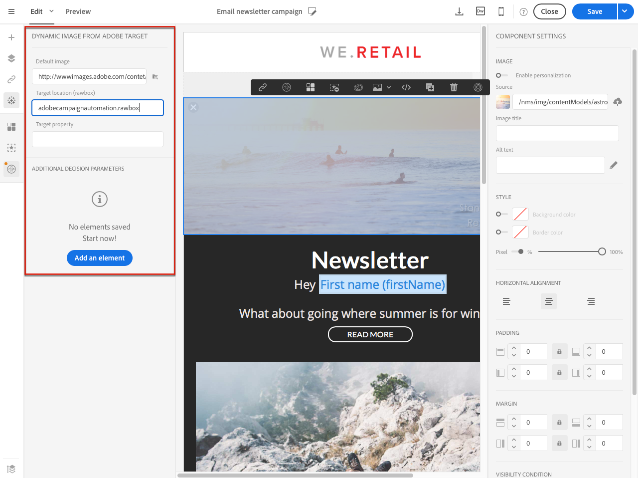 With Adobe Target integration, dynamic images can be added into a delivery to personalize your content depending of experiences.