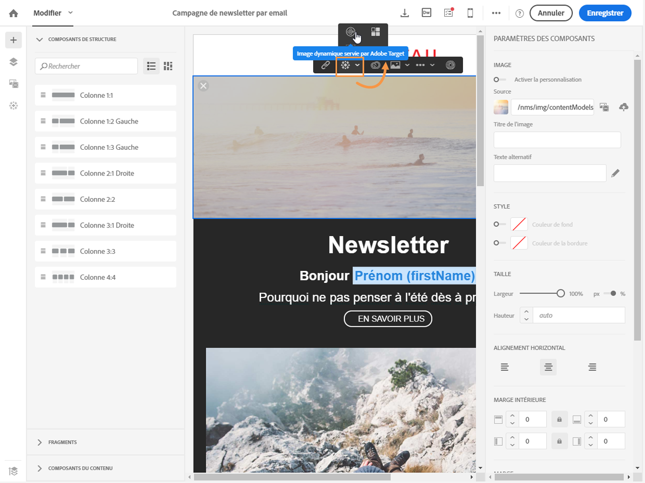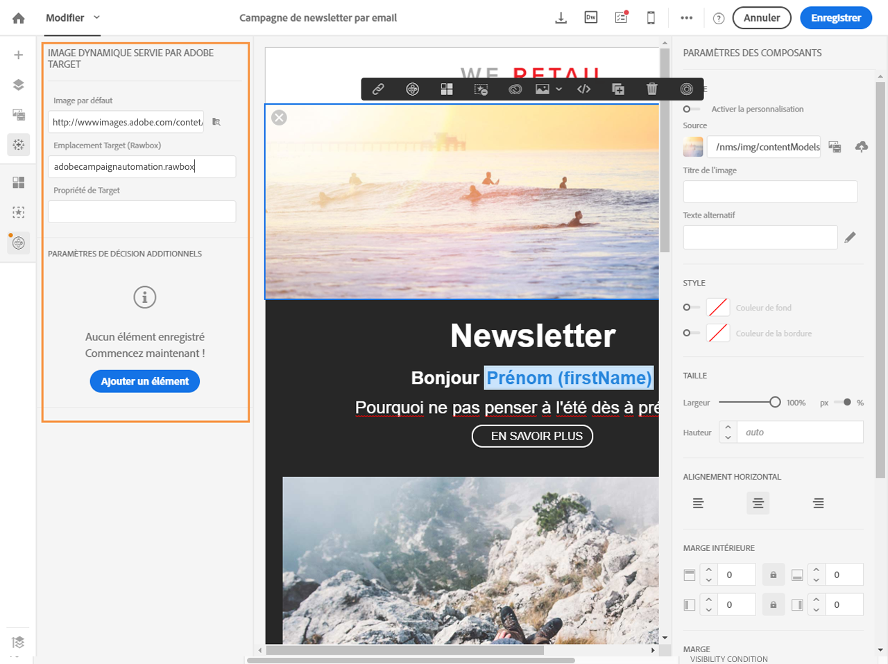Pendant l'édition d'un email, vous pouvez insérer depuis Adobe Target une image dynamique qui changera en fonction des destinataires.