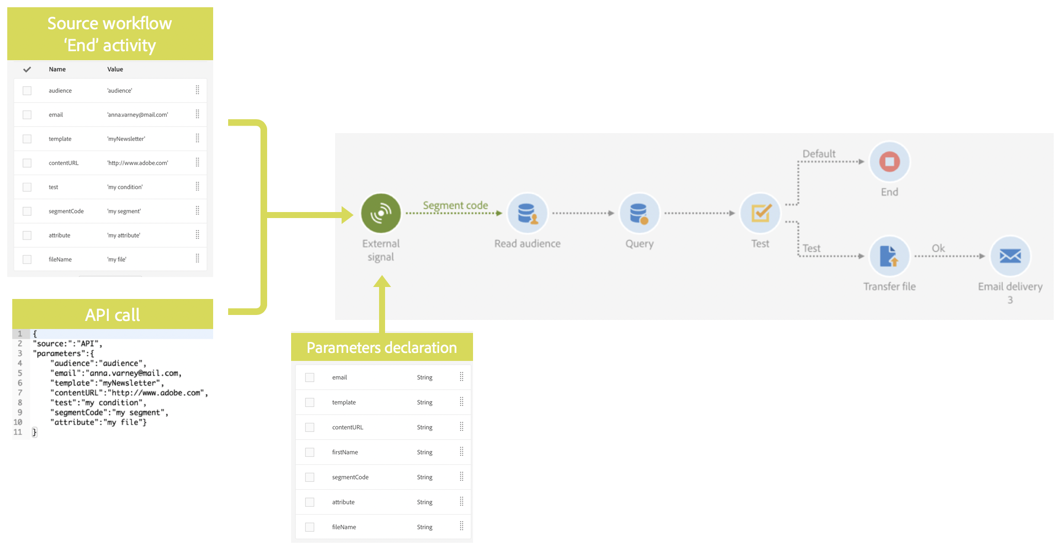 O Campaign Standard permite chamar um fluxo de trabalho com parâmetros (um nome de público-alvo para o target, um nome de arquivo para importar, uma parte do conteúdo da mensagem etc.). Dessa forma, você pode integrar facilmente as automações do Campaign ao sistema externo.