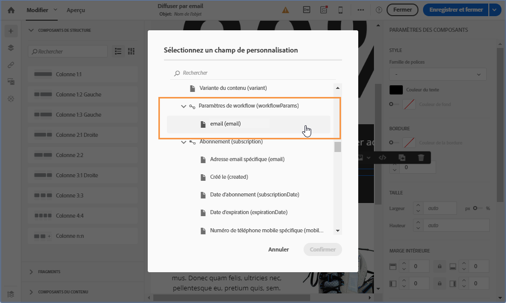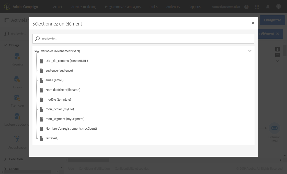 Les variables d’événements déclarées sont à présent disponibles dans la liste des champs de personnalisation. Vous pouvez les utiliser dans la diffusion de façon à réaliser les actions ci-dessous :