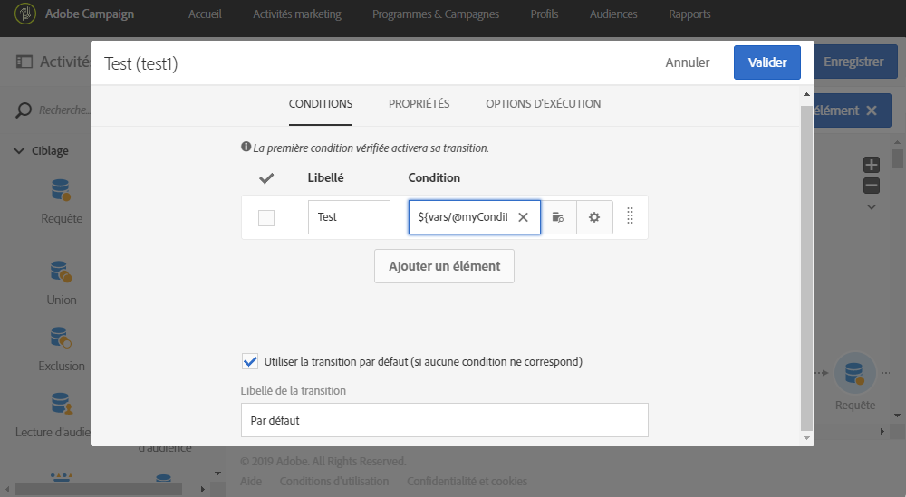 Activité Test : créez des conditions reposant sur des variables d’événements. Pour plus d’informations sur l’utilisation de cette activité, consultez cette section.