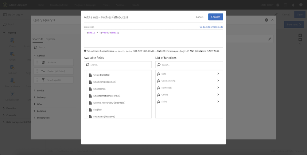 Query 활동: 이벤트 변수와 함수를 결합한 식을 사용하여 쿼리에서 매개 변수를 참조할 수 있습니다. 이렇게 하려면 규칙을 추가한 다음 Advanced mode 링크를 클릭하여 표현식 편집 창에 액세스합니다(고급 표현식 편집 참조).