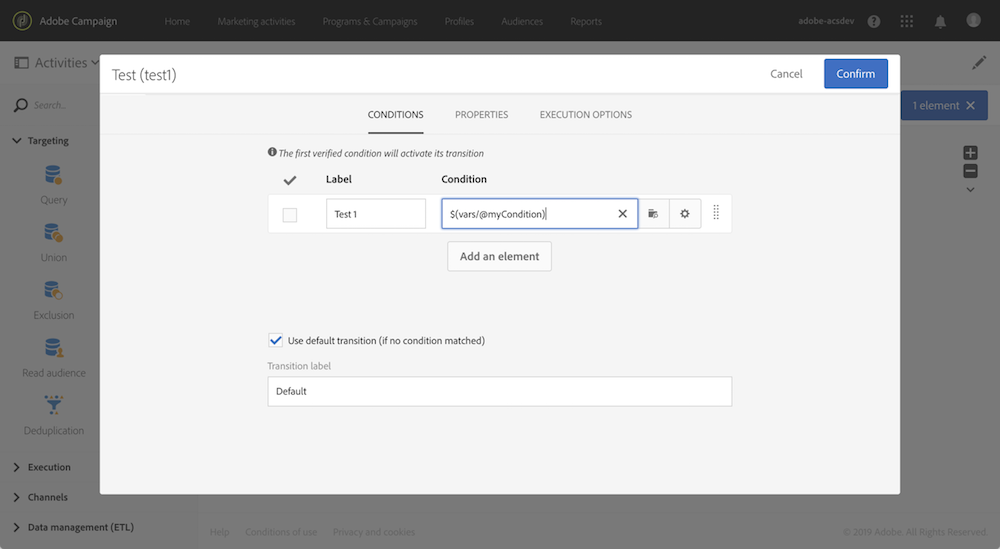 Test 활동: 이벤트 변수를 기반으로 조건을 빌드합니다. 활동을 사용하는 방법에 대한 자세한 내용은 이 섹션을 참조하세요.