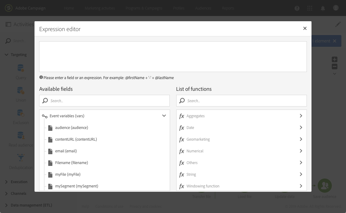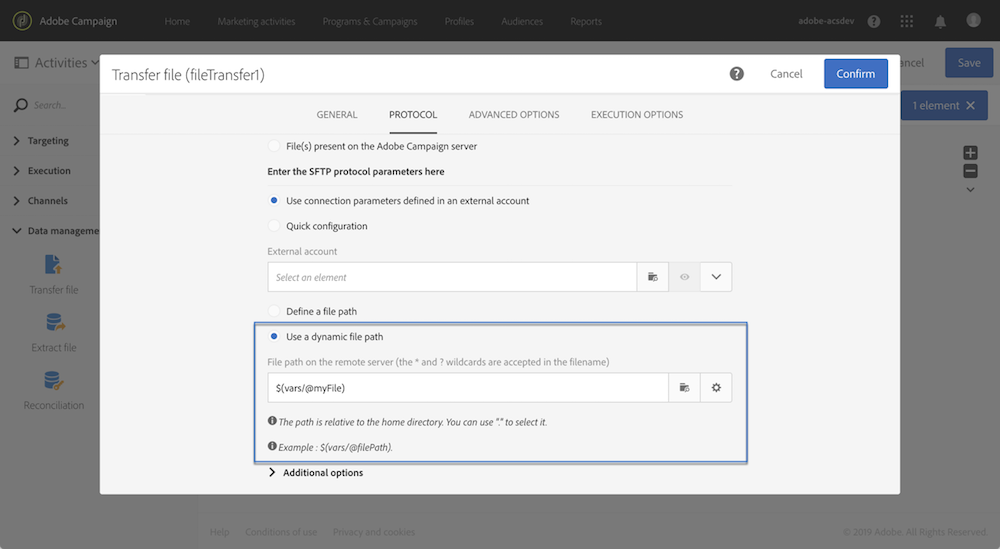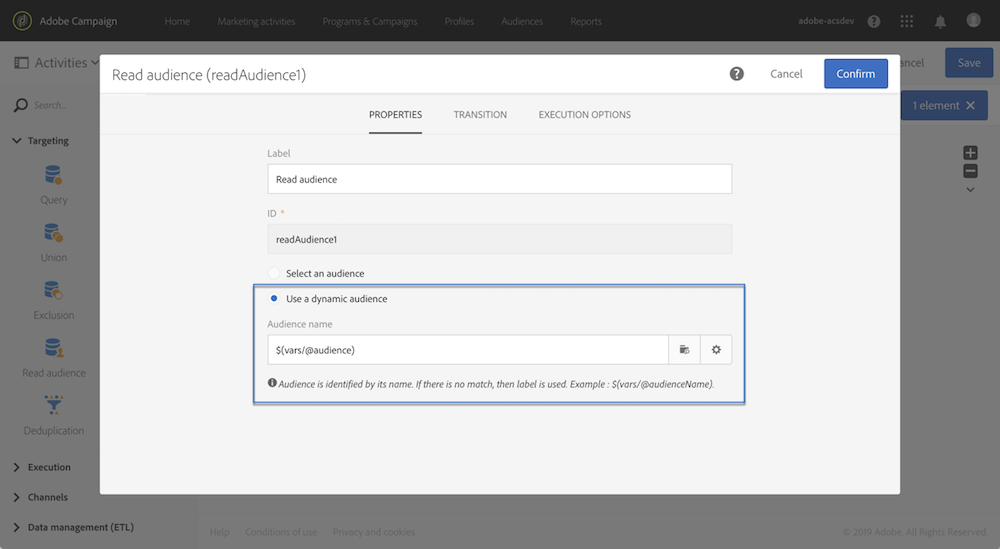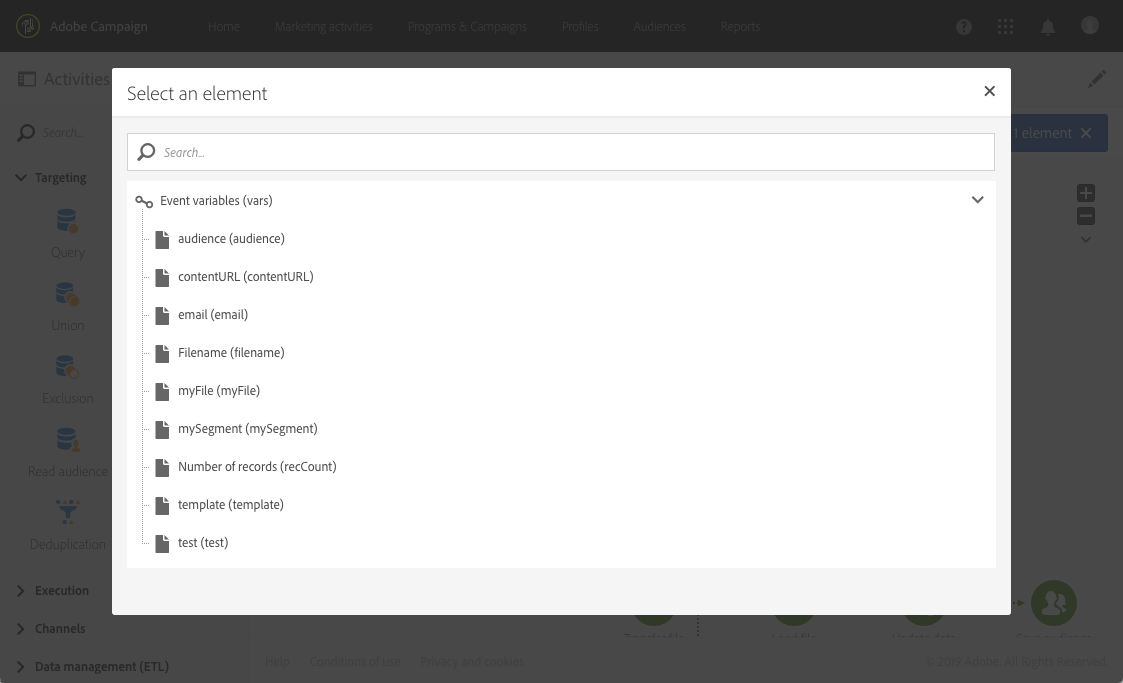 例如,它們可用來定義要在 Read audience 活動中讀取的對象、要在 Transfer file 活動中傳輸的檔案名稱等。 (請參閱此頁面)。