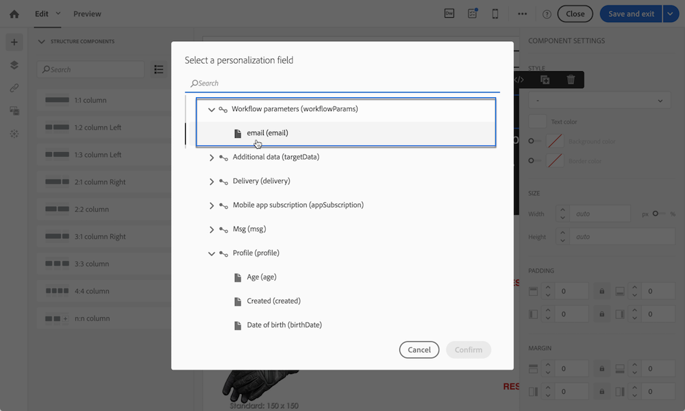 個人化傳遞:選取個人化欄位以設定傳遞時,Workflow parameters元素中提供事件變數。 您可以使用它們做為任何個人化欄位,例如定義傳送主題、寄件者等。