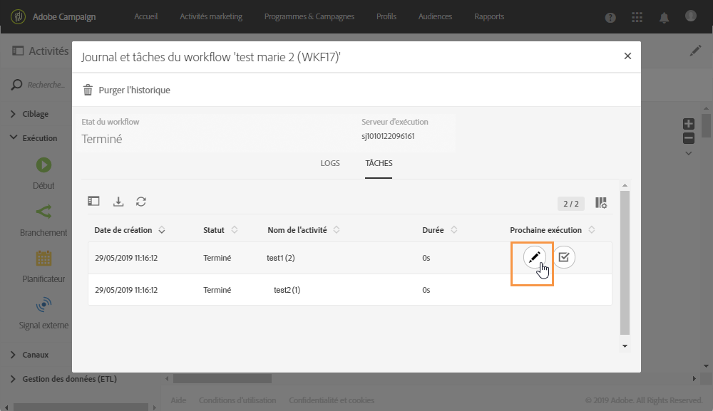 Sélectionnez l’activité qui suit l’activité Signal externe, puis cliquez sur le bouton Journal et tâches.