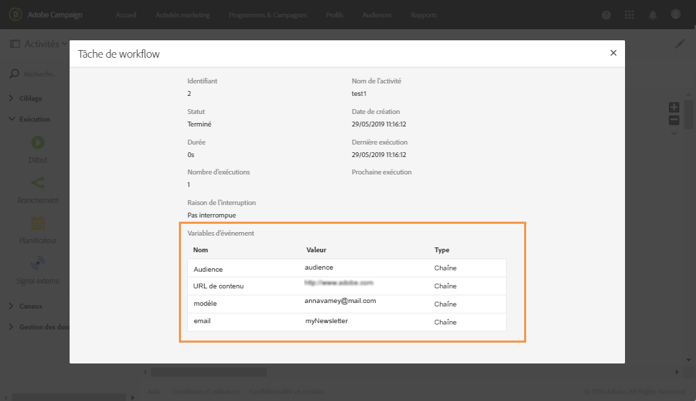 Le contexte d’exécution de la tâche s’affiche (ID, état, durée, etc.), y compris toutes les variables d’événements actuellement disponibles dans le workflow.
