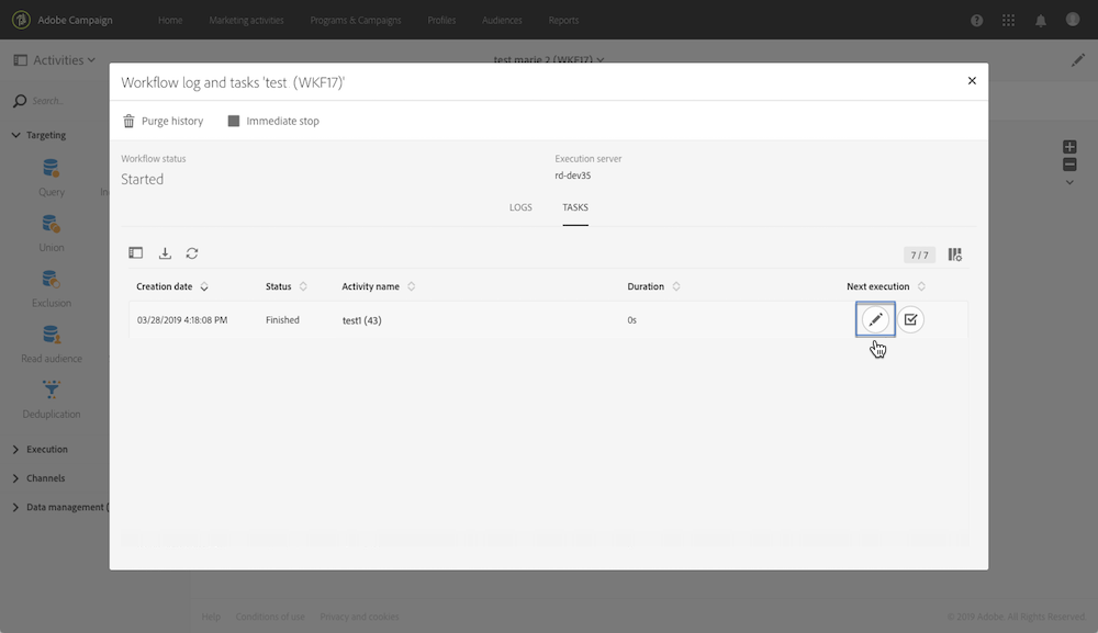 Selecione a atividade que segue a atividade External signal e clique no botão Log and tasks.