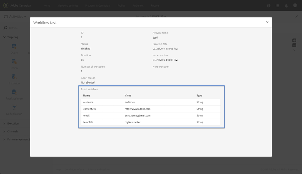 O contexto de execução da tarefa é exibido (ID, status, duração etc.), incluindo todas as variáveis de eventos que agora estão disponíveis para uso no fluxo de trabalho.