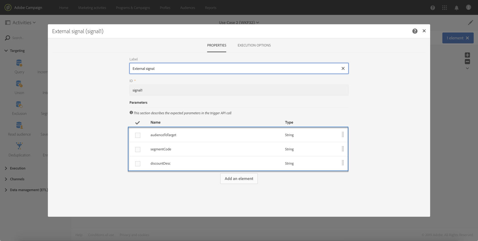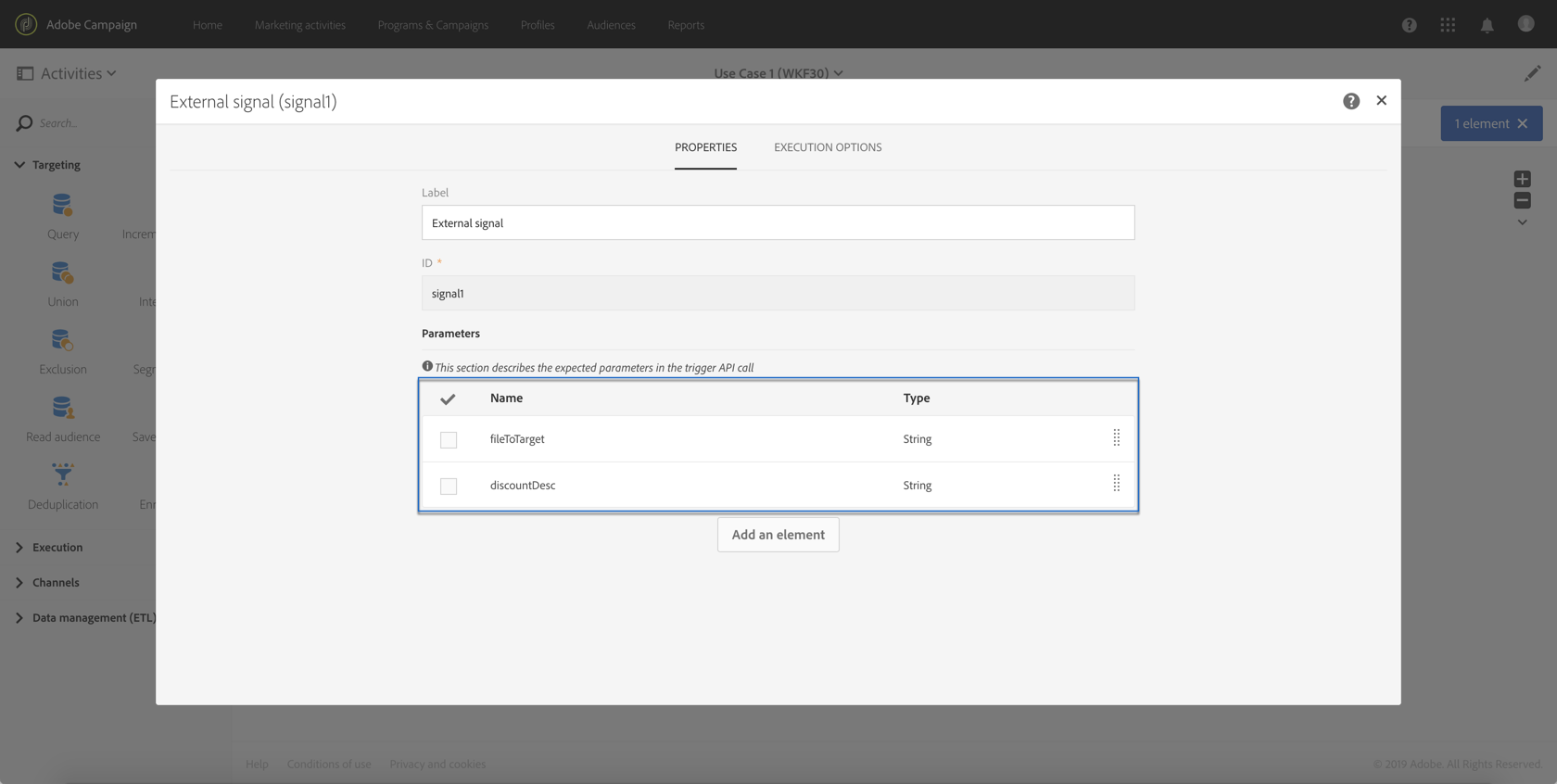 API 호출에 정의된 매개 변수를 선언합니다. 이렇게 하려면 External signal 활동을 연 다음 매개 변수의 이름과 형식을 추가합니다.