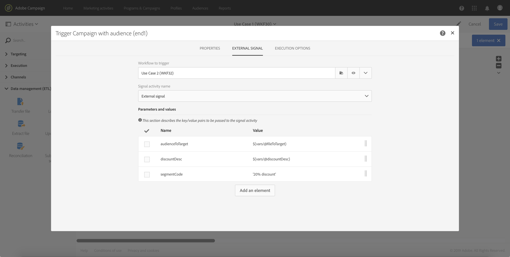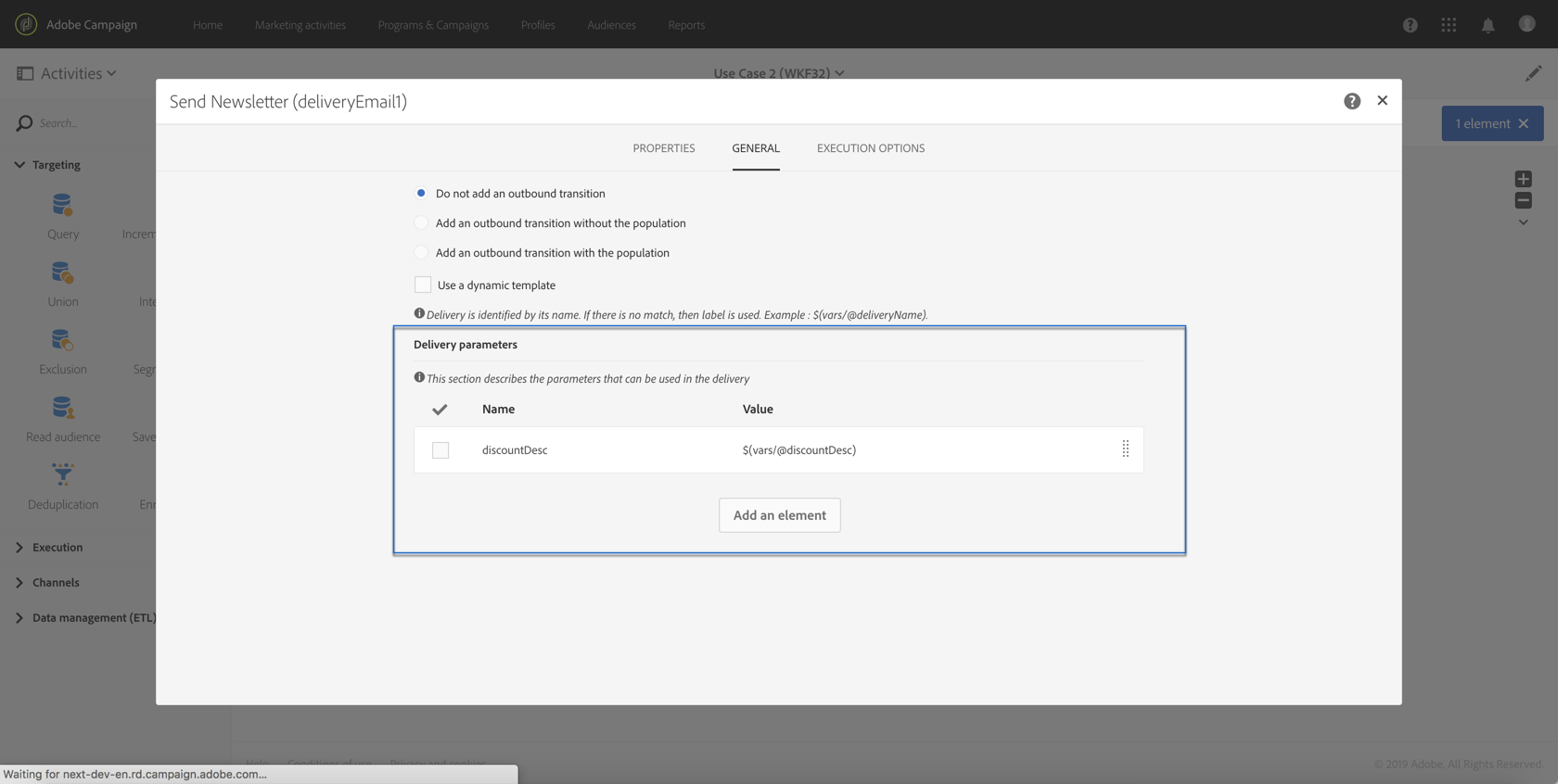 discountDesc 매개 변수를 사용하여 메시지를 개인화하는 데 사용할 매개 변수를 식별하십시오. 이렇게 하려면 활동의 고급 옵션을 연 다음 매개 변수 이름과 값을 추가합니다.