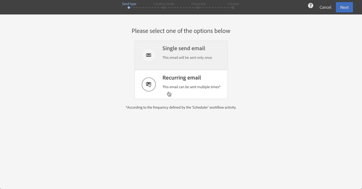 이제 메시지를 구성할 수 있습니다. 활동을 열고 Recurring email을(를) 선택합니다.