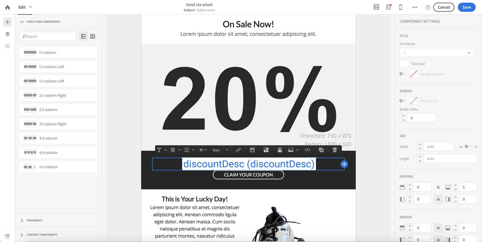 discountDesc 매개 변수를 개인화 필드로 사용하십시오. 이렇게 하려면 개인화 필드 목록에서 선택합니다.