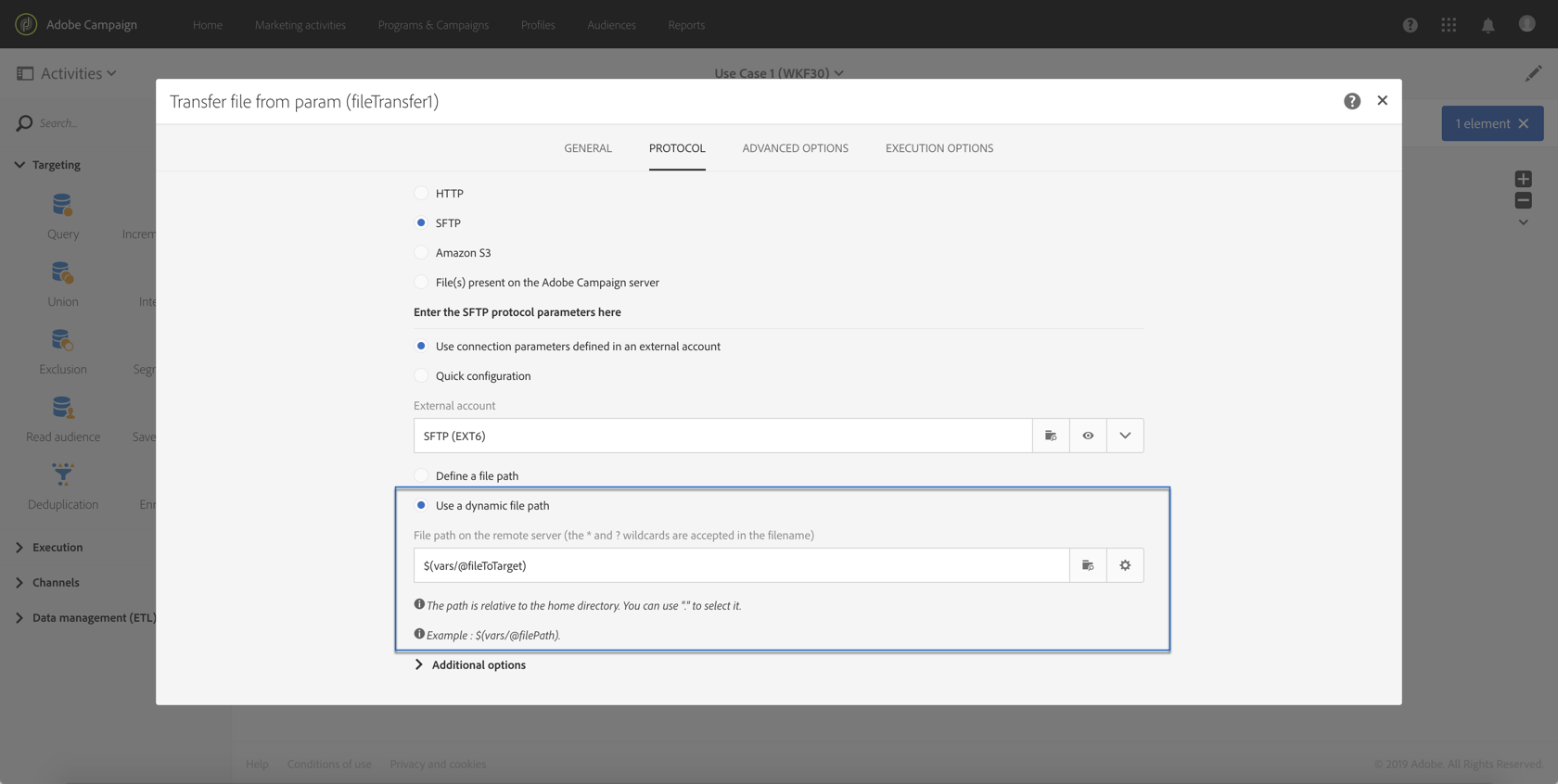 데이터를 데이터베이스로 가져올 Transfer file 활동을 추가합니다.이렇게 하려면 활동을 끌어다 놓고 연 다음 Protocol 탭을 선택합니다.