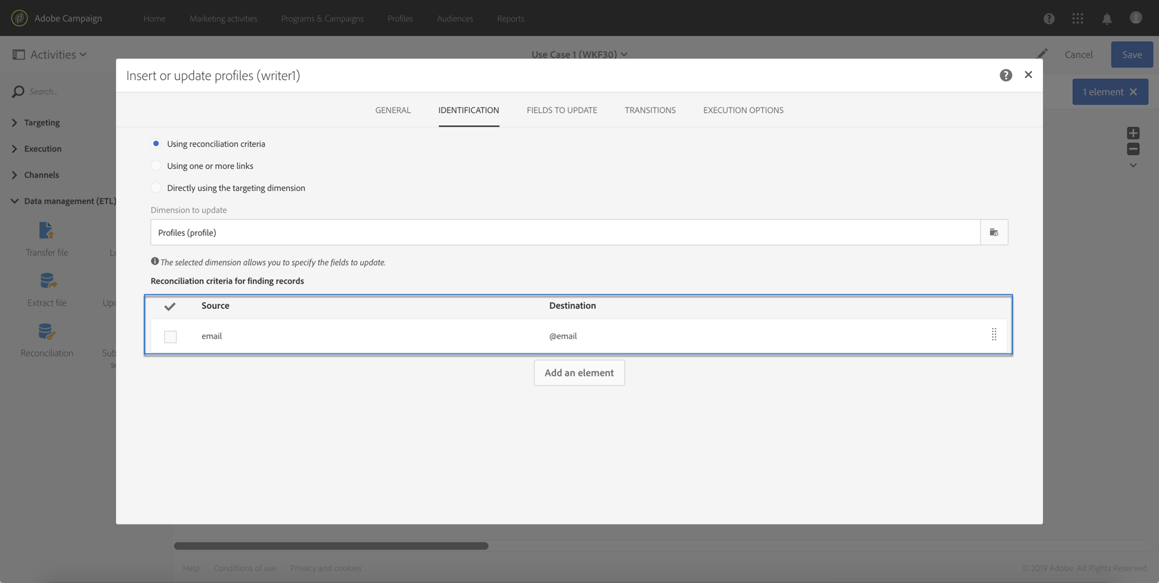이렇게 하려면 Update data 활동을 끌어다 놓은 다음 Identification 탭을 선택하여 조정 기준(여기서는 전자 메일 필드)을 추가하십시오.